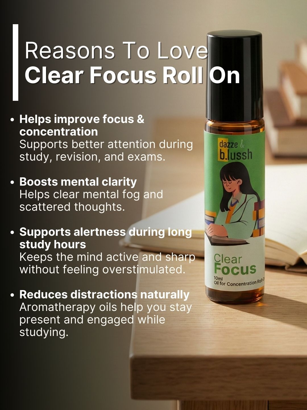 Made with natural aromatherapy oils, this combo supports a calm-then-focus routine — helping you feel relaxed before studying and stay sharp during long revision or exam sessions. Easy to use, pocket-friendly, and suitable for daily use during exams.