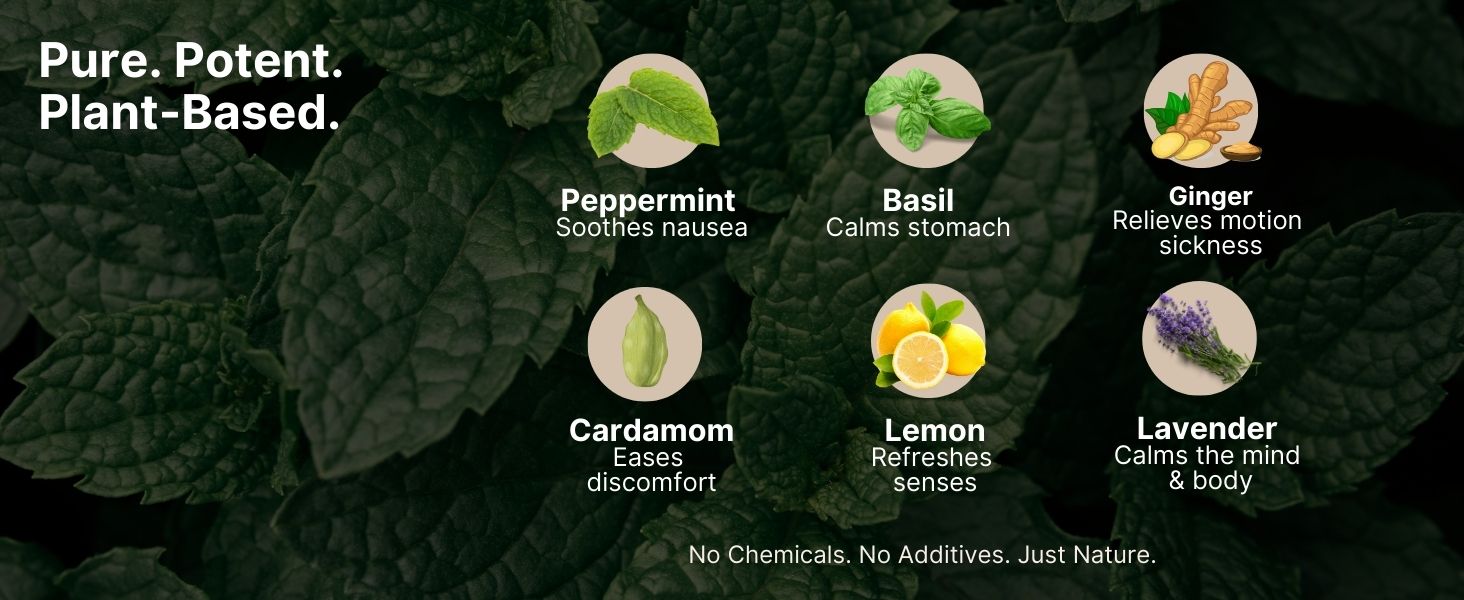 - Ayurvedic Essential Oil Blend: Contains peppermint, basil, ginger, cardamom, lemon, and lavender oils to soothe the senses and calm the stomach naturally.