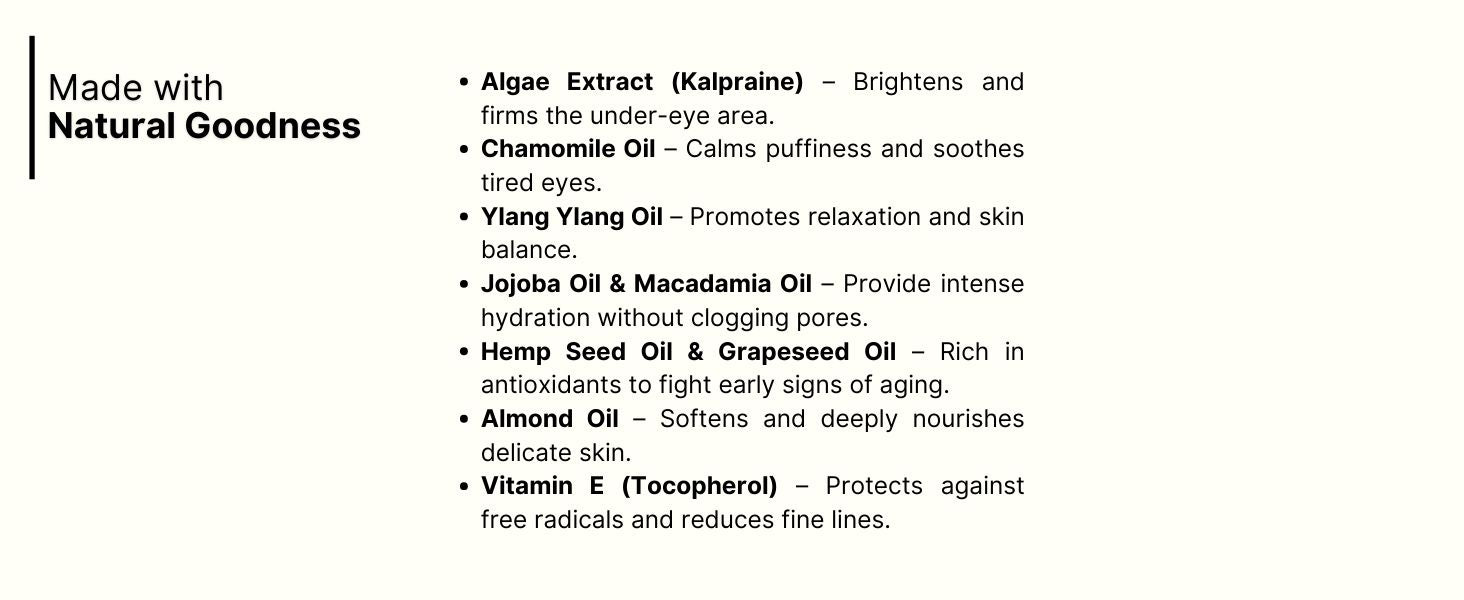 ✔ Reduces Dark Circles & Puffiness – Algae Extract (Kalpraine) brightens and smooths the under-eye area.